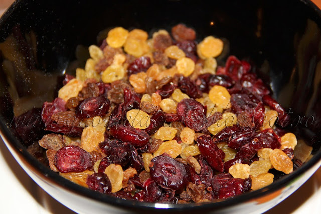 Se adauga nucile, stafidele cu merisoarele si merele,